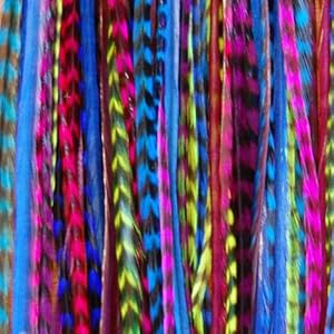 Pinks, purples, blues, aquas and bright green. -Seven feathers bonded together at the tip to make one feather extension -The feathers are real so the sizes and lengths are all different. No two feathers are the same -The feathers are 7-12" -These are thin feathers so they blend nicely in the hair -Treat them just like your hair